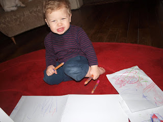 - loves drawing ( he loves his new crayons)... sometimes he thinks the chairs and the walls are his canvas ( oopppssssss)